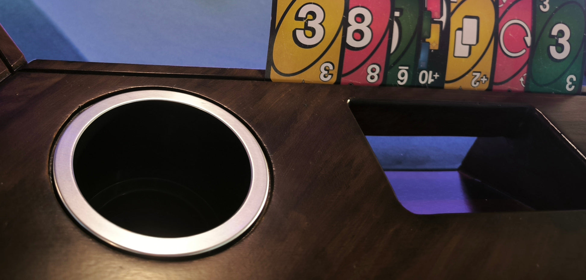 Mesa de juegos/comedor DELUX MODELO RECTANGULAR CON LUZ LED para 4 personas, cuenta con soporte para cartas y sistema para accesorios externo.