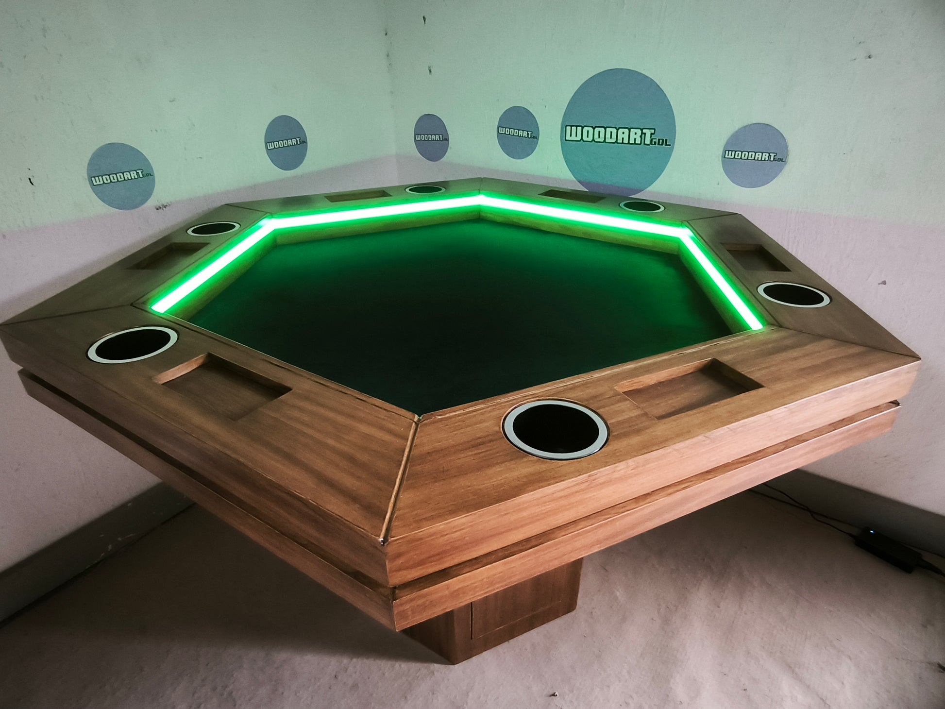 MESA DE POKER Y COMEDOR PREMIUM HEXAGONAL CON LUZ LED para 6 personas, cuenta con: